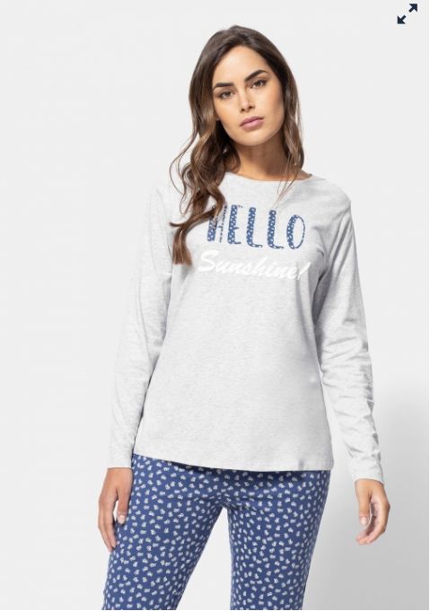 Si estás buscando un pijama que sea bueno, bonito y barato no busques más y pásate por el bazar de Carrefour. Porque en él vas a encontrar este que precisamente cumple con estas tres características. En la parte de arriba tiene estampado un bonito mensaje: hello sunshine. Y la parte de abajo, el pantalón, tiene un estampado de detalles sobre un fondo azul marino. Su precio es de tan solo 9’99 euros.