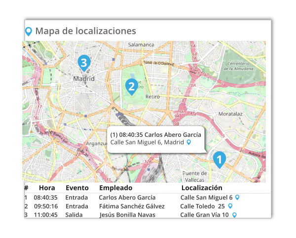 - Ver mapa de ubicaciones de los fichajes de sus empleados.