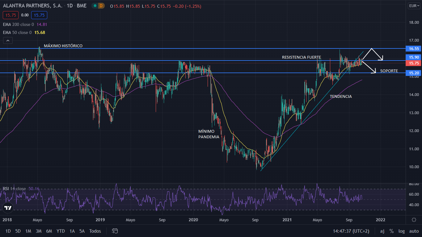 A nivel técnico, con el máximo histórico marcado en los 16,55 euros en 2018 y desde el mínimo marcado por la pandemia en los 12,35 euros, su precio continuar bajista hasta posicionarse en los 9,85 euros, acumulo una caída del 40%. Tras alcanzar dicho mínimo, su precio inicio una tendencia alcista sana, formada por fases de impulsos y retrocesos, haciendo un crecimiento del precio homogéneo, con un crecimiento del 63%. Actualmente el precio no ha conseguido superar los 16 euros, por lo que lo ha llevado a perder la tendencia alcista. Si su precio continua con la estructura de fases de impulso y retrocesos, aun habiendo salido de la tendencia, su precio podría romper nuevamente a alcista superado su máximo histórico. De lo contario si no consigue superar la resistencia actual, el precio podría definitivamente caer, siendo el primer soporte los 15 euros.