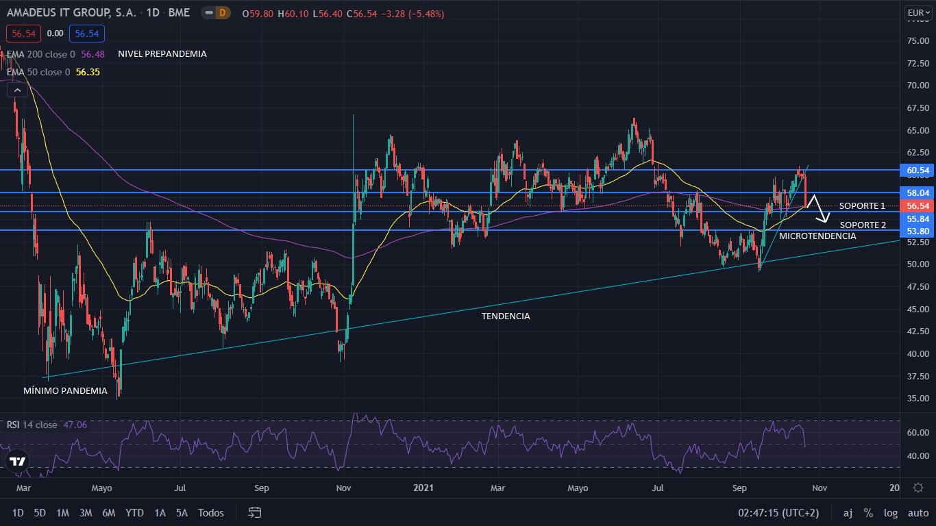 A nivel técnico, desde el mínimo marcado por la pandemia en los 36,90 euros por acción, Amadeus se lento sobre una tendencia alcista. Alcanzo su máximo postpandemia en los 66 euros. Su precio aún sigue sufriendo los daños por la pandemia, situándose a un 32% del nivel anterior a la pandemia. Actualmente el precio trae una microtendencia desde el 15 de septiembre, y que el día 20 de octubre veía perforado perdiendo un 6%, marcando el nivel de los 60 euros como una resistencia fuerte. Para el corto plazo el precio volvería al nivel 58 euros, y de continuar bajista, el precio ira al siguiente soporte en los 53,80 euros, situándose cerca de la tendencia principal, donde volvería a alcista.