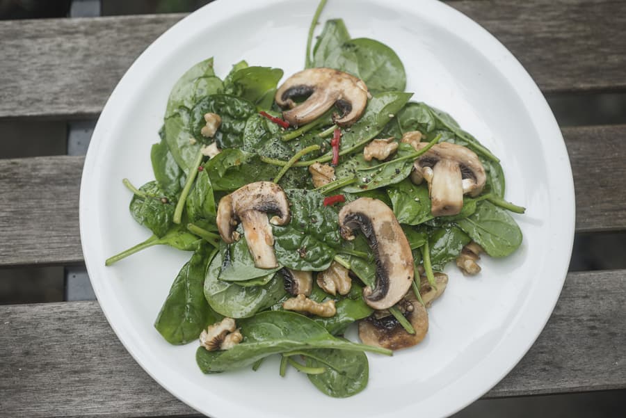 Después prepararemos lo que será la capa inferior de nuestra lasaña, que será la de champiñones salteados con espinacas. Para ello, limpiamos y laminamos los champiñones y los salteamos con un poco de aceite de oliva hasta que empiecen a dorarse. A continuación añadimos las hojas de espinacas, y les damos un par de vueltas, hasta que comiencen a ablandarse, que será en un par de minutos. Apagamos el fuego y reservamos.