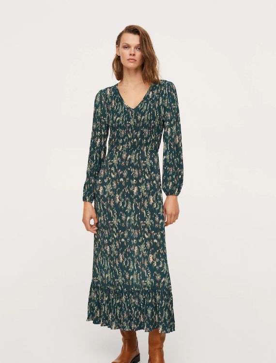 Este vestido de Mango es uno de los que mejor está funcionando en cuanto a número de unidades vendidas en cualquiera de sus tiendas. Y a nosotros no nos sorprende. Porque además de tener un estampado muy bonito, también destaca por el bonito efecto que crea la combinación de su manga larga con los puños elásticos junto con sus volantes en el bajo. Cuesta 29’99 euros.