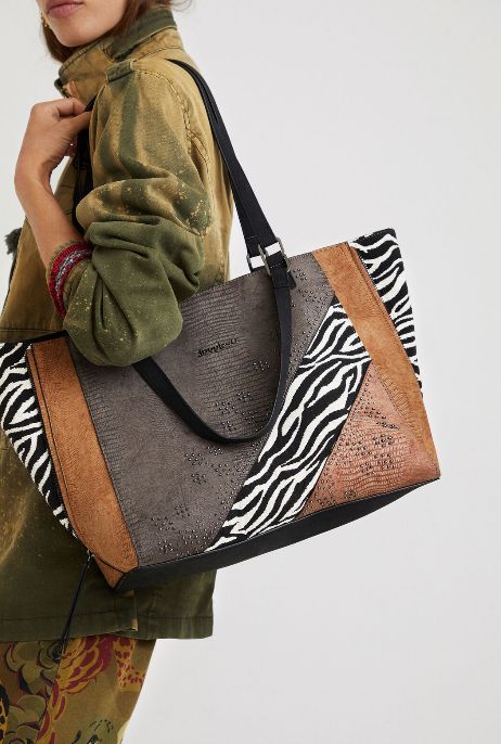 Si el bolso anterior, a pesar de que tiene un tamaño que se ajusta a lo que buscas no te ha acabado de convencer porque buscas uno que tenga un diseño más original todavía, pásate por Desigual y echa un vistazo a este modelo. Porque está diseñado a base de patchwork con diferentes texturas. Tiene tanto asa de mano como asa de colgar. Su precio es de solo 79’95 euros.