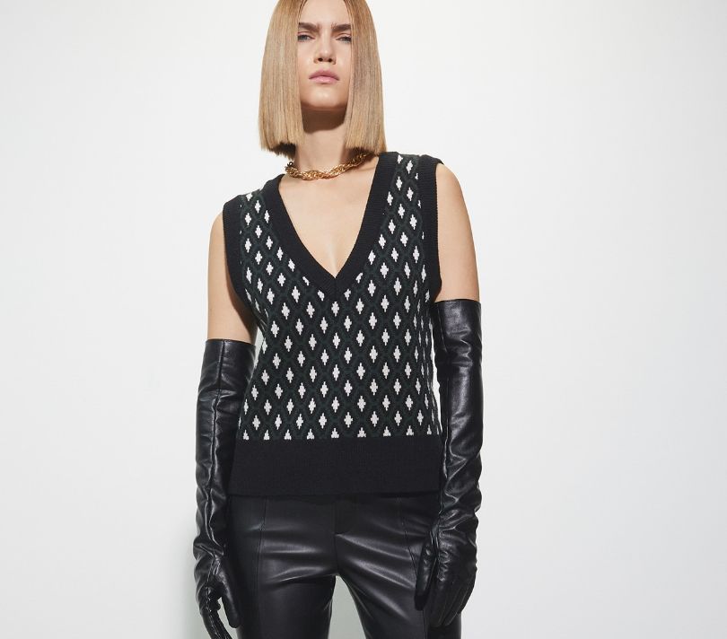 ¿Te has dado cuenta de que este otoño se llevan mucho los chalecos? A nosotros nos ha gustado mucho este que hemos visto en el catálogo de novedades de Sfera. Destaca por tener un estampado de motivos blancos con ribetes de contraste. Además sale muy bien de precio, ya que tan solo cuesta 19’99 euros.