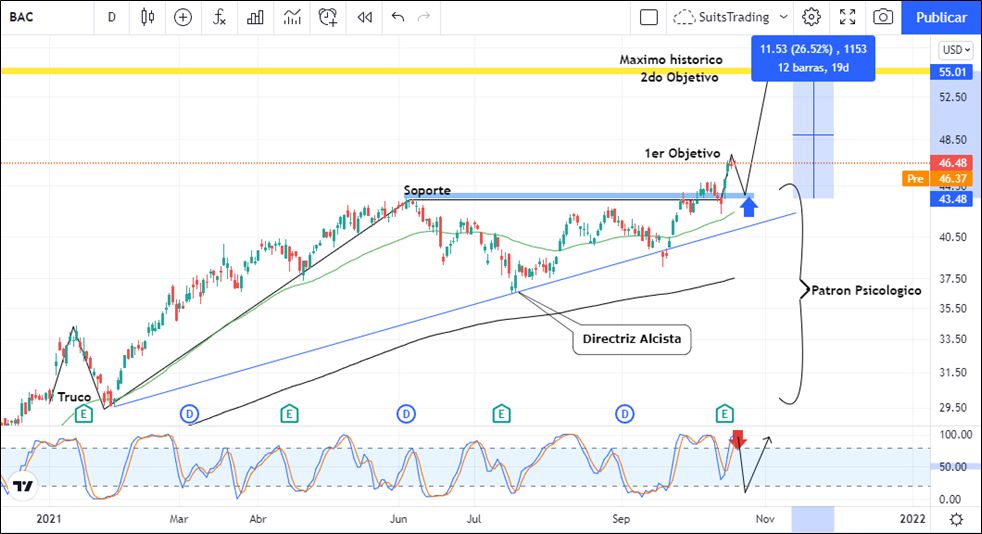Desde el pasado 14 de octubre, que fue el día de la presentación de los resultados, la acción de Bank of América ha subido más del 6%. Sin embargo, si analizamos el gráfico de marco diario, encontramos una formación creada en estructura alcista desde enero de 2021 la cual desarrolla un truco, es decir, una V invertida, alto del truco y lateralización en correlación a una directriz alcista que trabaja por encima de las medias móviles exponenciales que dan reflejo de la continuación alcista del precio de la acción, pero con un muy probable retroceso en el corto plazo.