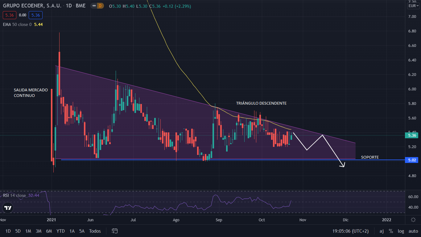 A nivel técnico, desde su salida en el Mercado continuo a un precio de 5,90 euros, Ecoener se ha movido en formación de triángulo descendente. Actualmente el precio se acerca a la salida de dicho triángulo. De cara al mes de noviembre, y tomando sus resultados del semestre su precio apunta a salir de forma bajista de dicha formación, perdiendo así los 5 euros.