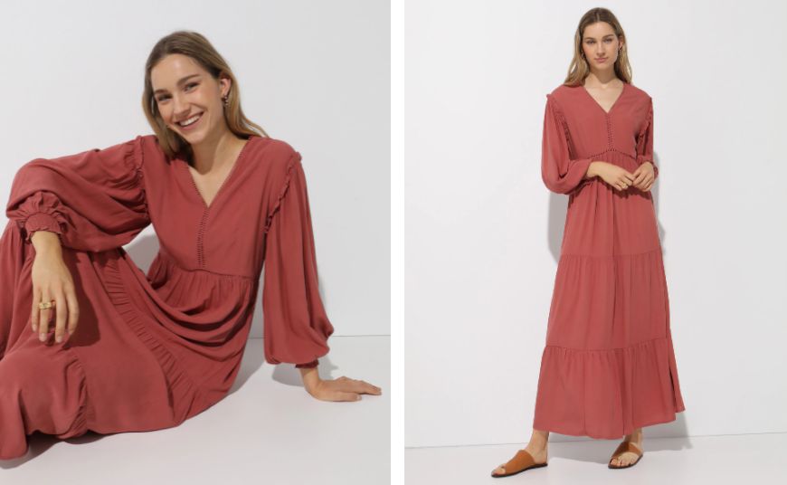Vamos ahora con la marca Easy Wear y nos quedamos con este otro vestido rebajado midi con manga abullonada, de estilo hippie pero elegante y más sofisticado. Se vende solo en color rosa y con el descuento se queda en 27,99 euros. Lleva escote en pico y está fabricado 100% en viscosa. Aquí puedes adquirirlo directamente desde la web de El Corte Inglés.