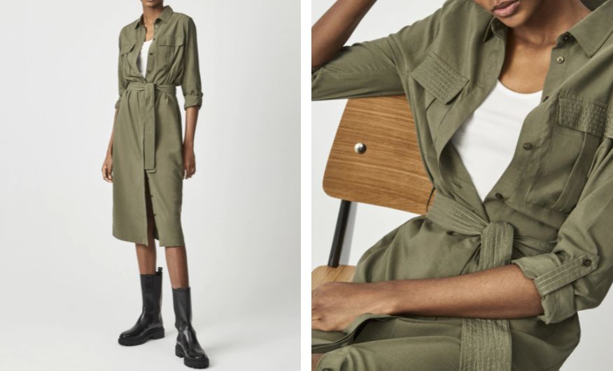 Está fabricado en tejido fluido con cuello camisero y cierre delantero abotonado. Es un fit relajado con detalle de cinturón a juego y mangas remangables con botón. En este enlace puede ser tuyo a dos clics.