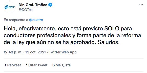 Ante la alarma generada por la supuesta obligatoriedad de tener que instalar un dispositivo de más de 1.000 euros en los vehículos, la DGT ha tenido que salir en Twitter a desmentir esta noticia y aclarar que solamente será obligatorio para los conductores profesionales, quienes sí tendrán que desembolsar dicha cantidad. En cualquier caso esta nueva Ley Sobre Tráfico, Circulación de Vehículos a Motor y Seguridad Vial está todavía en proceso de ser aprobada y aún debe pasar por el Senado.
