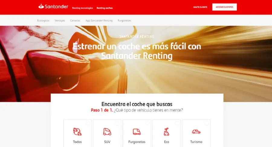 Para hacer todo el proceso más rápido y sencillo, Banco Santander en España ha diseñado en su página web un buscador especializado para facilitar la tarea y obtener resultados adaptados a las necesidades de cada cliente. Permite identificar el tipo de vehículo que el usuario tiene en mente (SUV, Furgonetas, Eco o Turismo) o realizar la búsqueda según la marca. Además de turismos, ofrece coches industriales, hasta 3.500 Kg. de P.M.A., de cualquier marca.