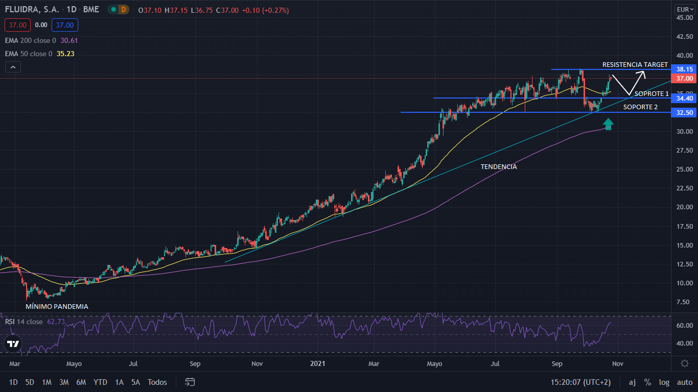 A nivel técnico, Fluidra acumula una subida de más del 400% desde el inicio de la pandemia. Con su máximo marcado en los 38 euros, Fluidra realizaba su primera caída tras 19 meses de subida, en la que ha perdido un 14%. Su precio volvía alcista, con un crecimiento casi vertical de 10 días alcistas. Actualmente el precio se encuentra cerca de situarse en su máximo histórico. Para el corto plazo, el precio retrocederá a la línea de tendencia, y de no perderla, superaría su máximo histórico. Añadir que en los próximos días se publicarán sus resultados del tercer trimestre y esta fuerte subida, nos dejaría pistas de que serán aun mejores a los del segundo trimestre, y de ser así, superaría ampliamente los 38 euros, marcando un nuevo máximo histórico.