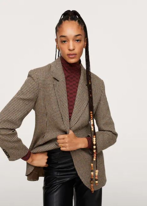 La americana detalle pinzas, es una de las más bellas chaquetas que tienen las tiendas Mango para ti en este otoño. Tejida con mezcla de lana, en dos modelos liso y estampada, entallada a tu cuerpo, detalles vistosos de pinzas y con mangas largas con puños abotonados.