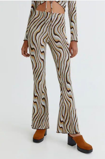 Para combinar cualquiera de las prendas de la casa de Papel, Pull&Bear tiene este delicado y moderno Pantalón campana Ondas. Con estampado en ondas que le darán vida a cualquier prenda con el cual lo combines.