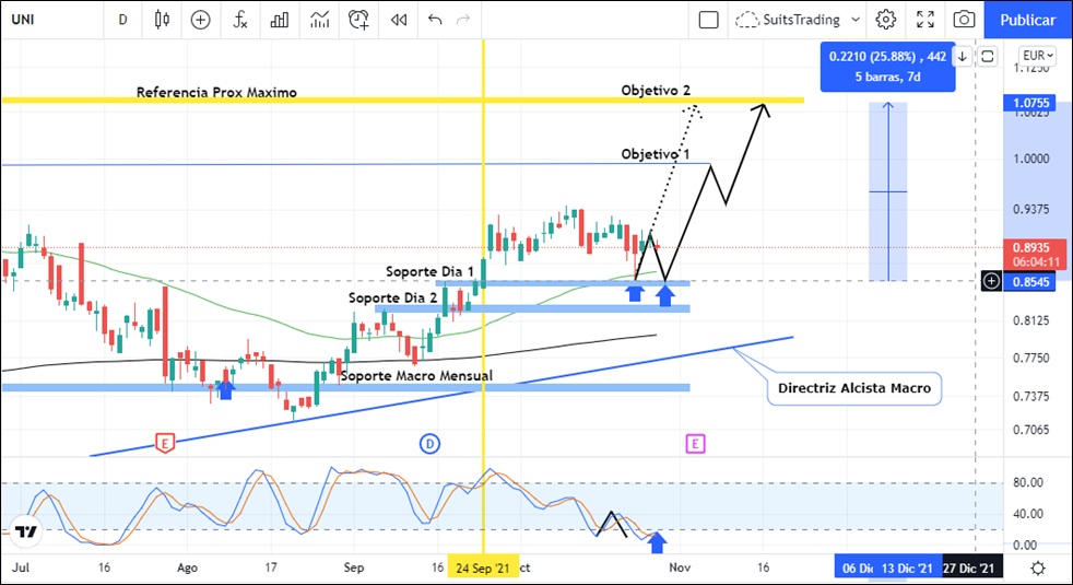 Posterior a ello encontramos dos soportes de marco diario el 7 de septiembre en inmediaciones de 0,8110 euros, así como el soporte más cercano en los 0,8540 euros del 17 de septiembre, el cual ha ido a tocar el pasado 27 de octubre con una vela de tipo pinbar alcista. Este movimiento está acompañado de la media móvil exponencial de 50 periodos de corto plazo, el cual puede generar un impacto al alza en busca de un primer objetivo ubicado en 0,996 euros por acción y como segundo objetivo, un precio de referencia máximo anterior el niveles de 1,07 euros por acción.