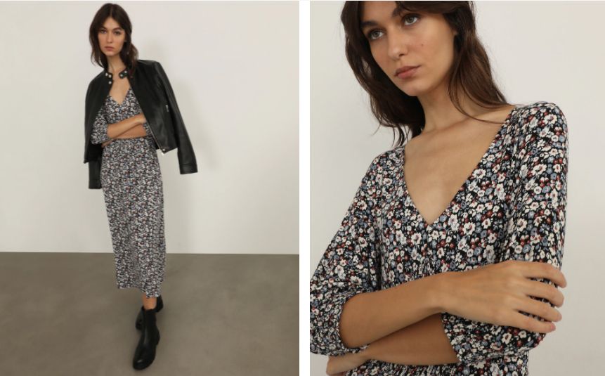 Se trata de un vestido estampado de manga francesa con escote pico, fajín elástico debajo del pecho y abertura en la falda. Está fabricado en poliéster y elastano y con el 30% se queda 39,99 euros. Lo tienes aquí para comprar en negro o azul marino.