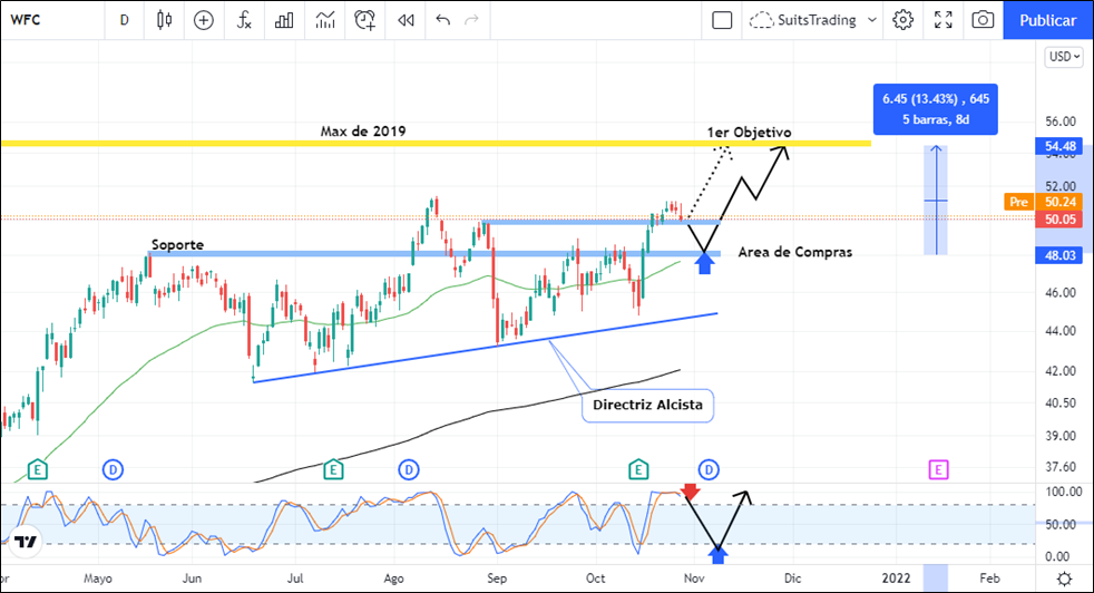 Debido a que el precio de la acción de Wells Fargo presenta un índice de fuerza relativa en niveles extremos de sobrecompra, es probable que el precio genere un retroceso mayor que esperamos sea hasta el soporte más importante de mayo de 2021. De esta forma, la operación iría igualmente a favor de la tendencia alcista y de la media móvil exponencial de 50 periodos de corto plazo siempre y cuando, respete la confluencia entre la media móvil y el soporte en los 47,98 dólares nos indicaría el punto de giro para la continuación alcista en busca del precio de referencia en máximos de 2019 en niveles de 54,8 dólares por acción lo que equivale a una rentabilidad superior al 13% para el corto plazo.