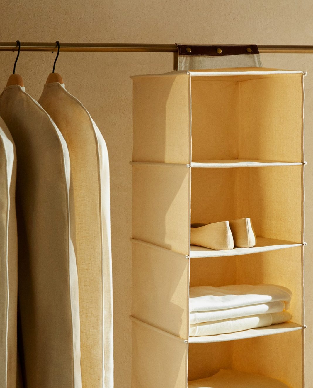 Una pieza ideal, para tener tu closet totalmente en armonía, es el Organizador de canvas y piel para colgar. Con diversos compartimientos, elaborado con tejido de canvas, lo cuelgas fácilmente con una lengüeta de piel, que trae broches a presión.