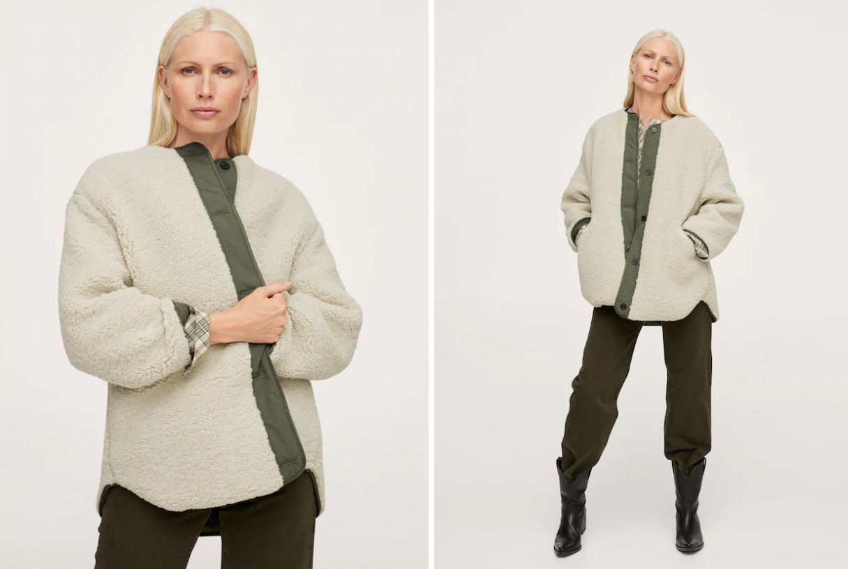 Como ves el borreguito es tendencia y en Mango hay más propuestas como esta cazadora combinada de la colección Committed. De diseño recto y cuello redondo, lleva dos bolsillos laterales y otros dos interiores, además de forro interior acolchado y cierre de botones en la parte delantera.