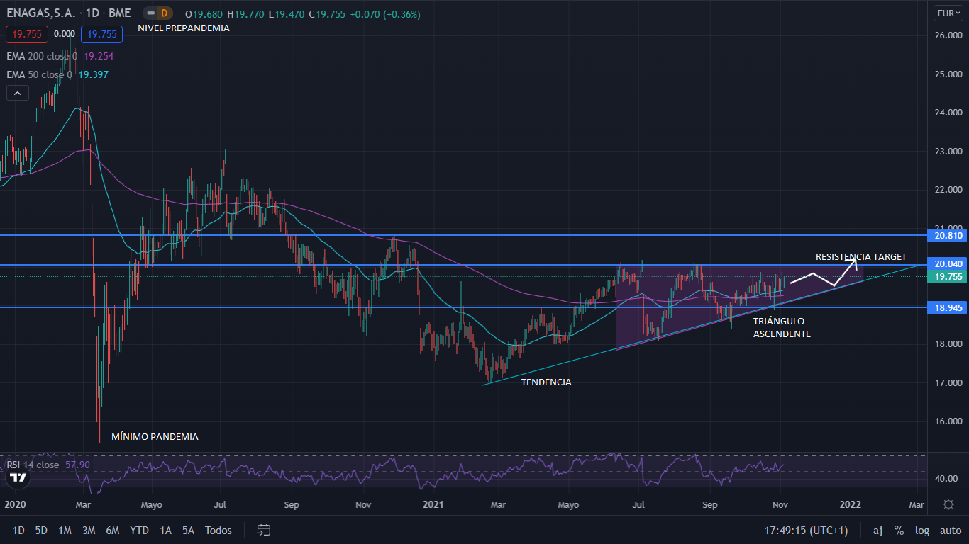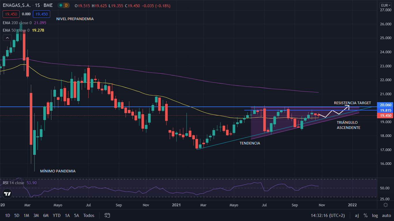 A nivel técnico, con los resultados inferiores al ejercicio anterior y los beneficios cerca del objetivo del ejercicio, la cotización de Enagás, podría atascarse en su recuperación tras la pandemia. Su precio se sitúa a un 32% de su nivel prepandemia. Desde que inició la tendencia bajista semanal en 2015, Enagás aún no ha mostrado indicios a salir de dicha tendencia bajista. Por lo que, en un largo plazo, para Enagás se visualizan los cortos. Actualmente su precio se encuentra dentro de una formación de triangulo ascendente, con los 20 euros como parte superior. Para el corto plazo, continuara con su movimiento dentro del triángulo, que a su vez lo acompaña la tendencia. Si Enagás supera los 20,140 euros, su pecio se situaría fuera de la tendencia bajista semanal.