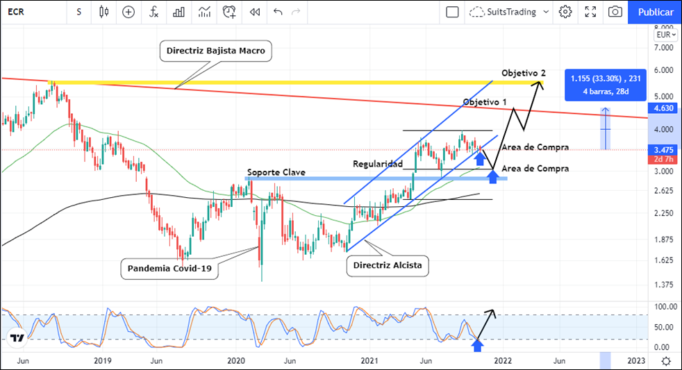 Por otro lado, encontramos que, si el precio realiza una ruptura de la directriz alcista o nivel inferior del canal, podría visitar el área de regularidad de mercado que confluye con el nivel 61,8 de retroceso de Fibonacci y con la media móvil exponencial de 50 periodos hasta niveles de los 3 euros por acción desde donde podría retomar su continuación al alza. Esta operación daría cerca de un 50% de beneficio al primer objetivo ubicado en la directriz bajista macro.
