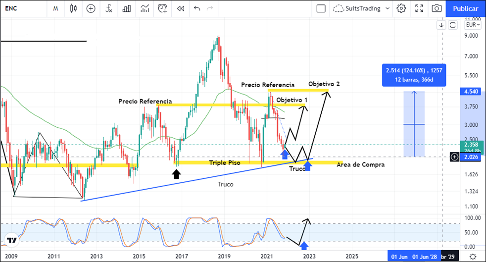 De ser respetado dicho nivel siendo precio de referencia a modo de triple piso, el precio podría generar un movimiento alcista. Si desarrolla una formación de truco, es decir, una V invertida, como lo señalamos en el gráfico, sería confirmación del fin de las caídas para la acción de Ence desde el punto de vista técnico el cual, apalancado del índice de fuerza relativa que se encuentra en niveles cercanos a la sobreventa, indicaría el precio de entrada en compra arriba de los 2 euros para ir a buscar inicialmente niveles de 3,79 euros equivalentes a los máximos de 2015 para posteriormente visitar nuevamente los 4,5 euros equivalentes a máximos de este año. Operaciones de largo plazo que otorgarían más de un 120% de rentabilidad.