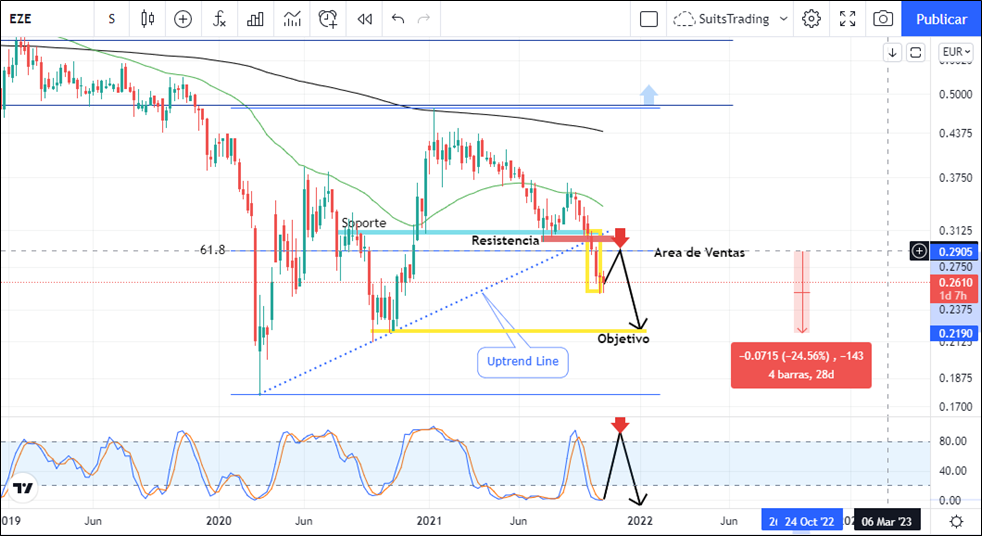 El gráfico de marco semanal de Ezentis presenta una directriz alcista que se forma desde marzo de 2020 confirmándose en octubre y noviembre de 2020. Esta directriz ha sido quebrada en la segunda semana de octubre y adicional a ello, dado el problema de Ezentis con la venta de sus filiales en Latinoamérica, el precio de la acción ha realizado una ruptura de la regularidad del mercado que confluye con el nivel 61,8 de retroceso de Fibonacci. De esta forma, es muy probable que el precio de la acción de Ezentis siga cayendo a buscar niveles de octubre del año pasado cercanos a los 0,22 euros por acción.
