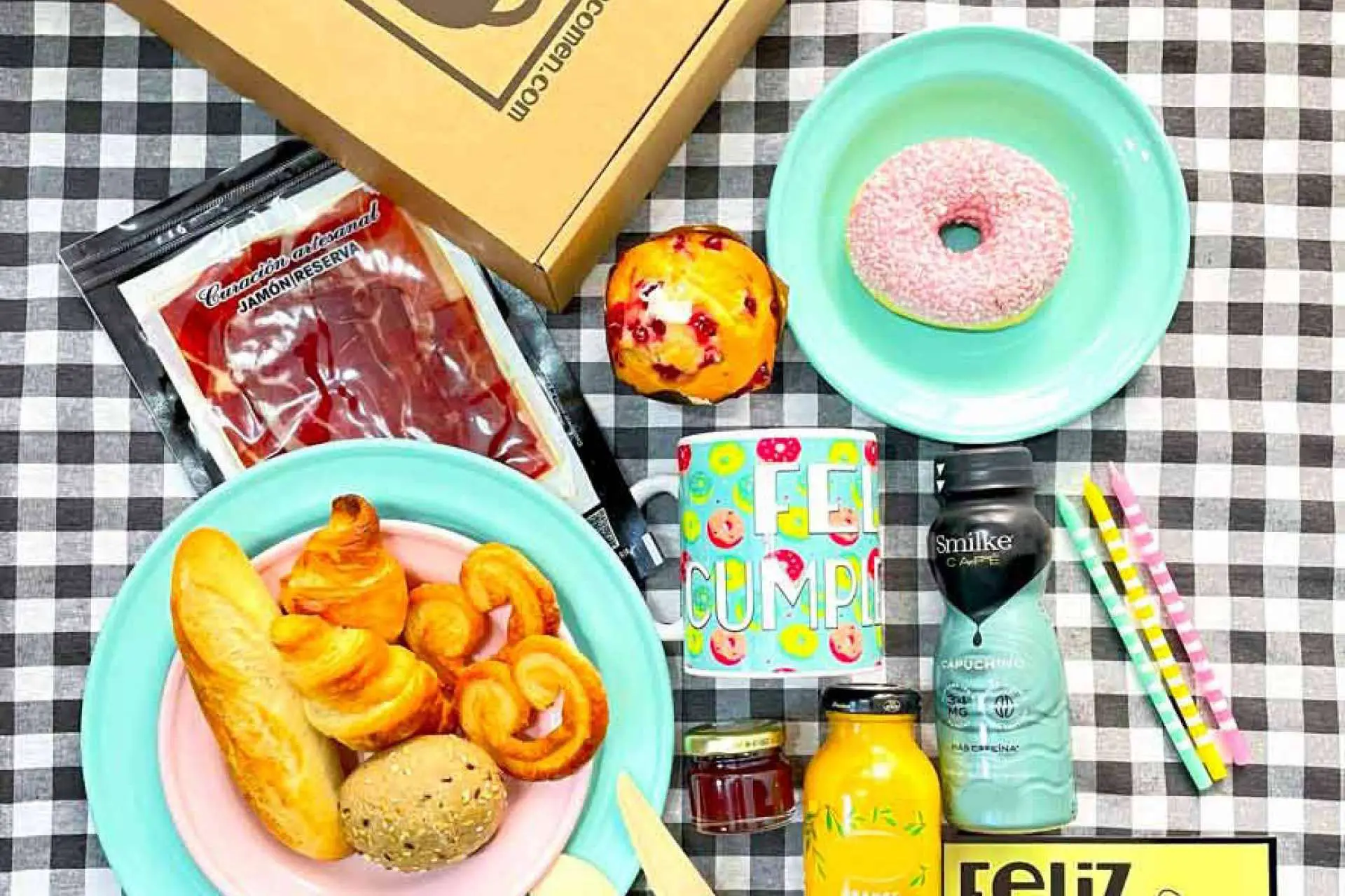 Una de las presentaciones más solicitadas es el «Desayuno Cumpleañero», una muy buena manera de hacer feliz a esa persona especial desde primera hora del día, con opciones como café, té o zumo, además de un muffin, un donut, dos croissants de mantequilla, dos palmeritas, un sobre de ibérico, un pan pepito y otro de 8 cereales. Como complementos, el homenajeado recibirá tomates troceados, mermelada, aceite de oliva virgen extra, así como una dedicatoria especial.