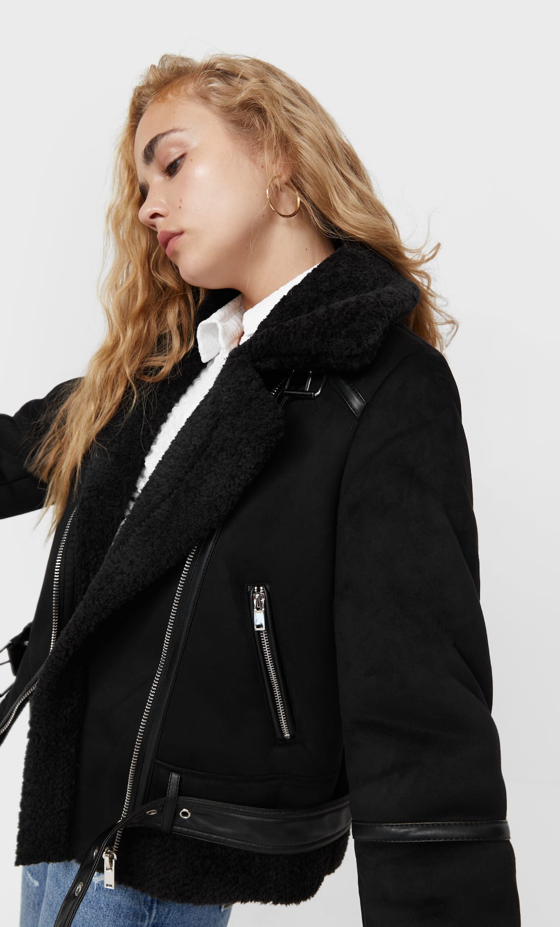 Este año los abrigos y cazadoras recuperan modelos clásicos que todas hemos llevado alguna vez. Por eso no hemos podido resistirnos a esta cazadora biker de efecto ante con un interior en tejido de efecto pelo.