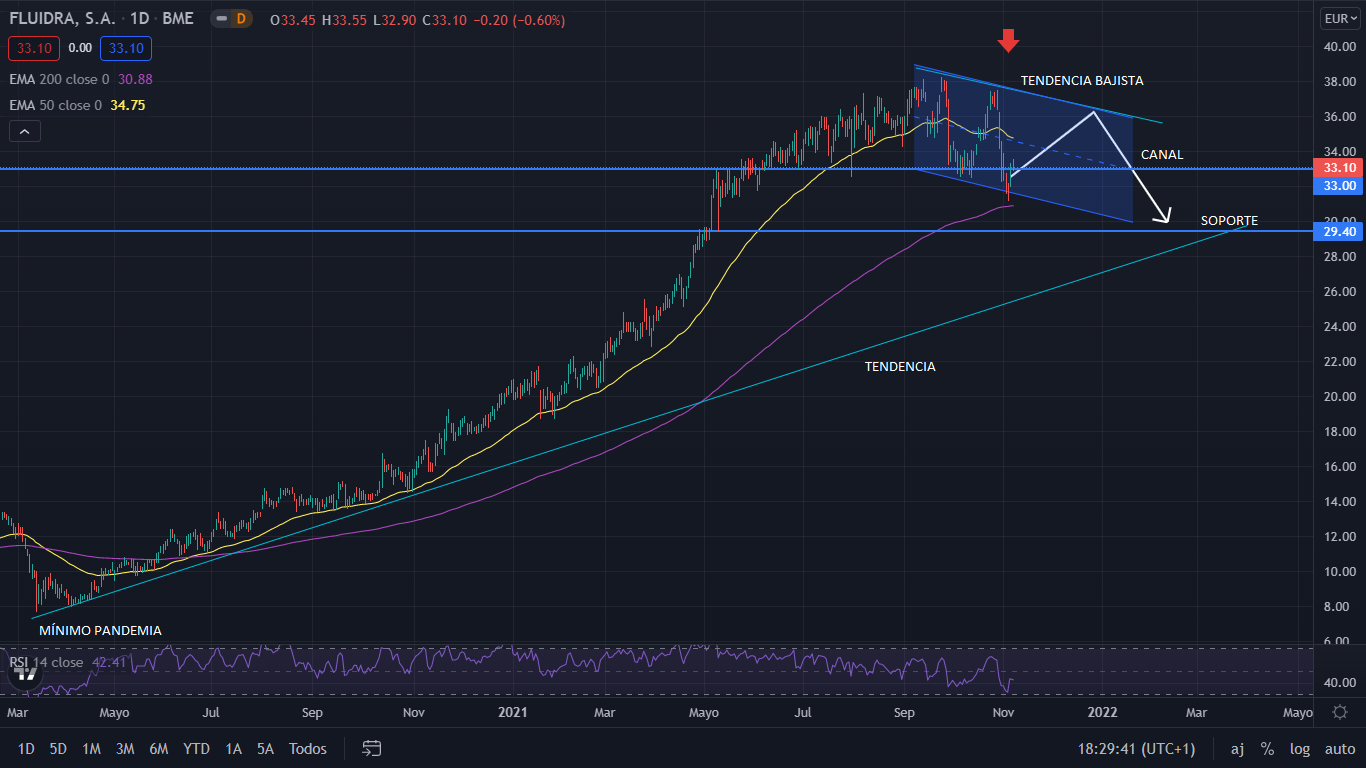 A nivel técnico, Fluidra acumulaba una subida de más del 400% desde marzo de 2020. Con su máximo marcado en los 38 euros, Fluidra realizaba su primera caída tras 19 meses de subida, en la que ha perdido un 14%. Tras el intento de volver a superar su máximo anterior, su precio marcaba un máximo decreciente, dando pies un inicio de tendencia bajista. Actualmente el precio se sitúa en los 33 euros, donde parece marcar mínimos decrecientes, formado un canal bajista. Para el corto plazo, su proyección del precio es bajista, con objetivo en la línea de tendencia alcista. De tomar la caída como una corrección el precio rebotaría en la tendencia y volvería a alcista. De lo contrario si perforara dicha línea Fluidra entraría en una caída libre sin un soporte claro a la vista.