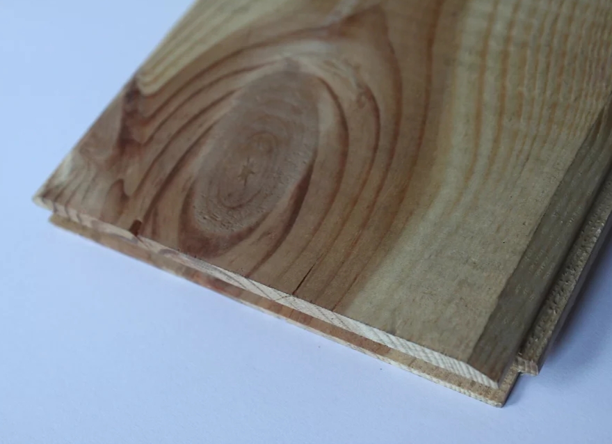 Unas láminas de madera con bisel, para uso interior, espesor de 17 mm, con dimensiones de 11.5×210 cm de ancho y largo respectivamente. Se venden en paquetes de 1.21 metros cuadrados (5 unidades).