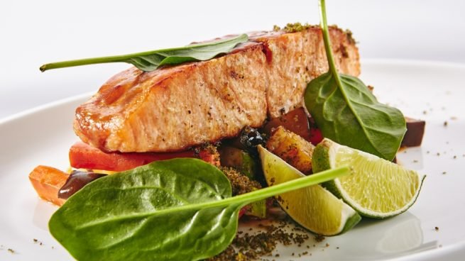 Ahora que ya lo tienes todo listo es hora de montar el plato y servirlo a la mesa. Coloca en primer lugar la crema de berenjena haciendo de base y sobre ella el lomo de salmón.