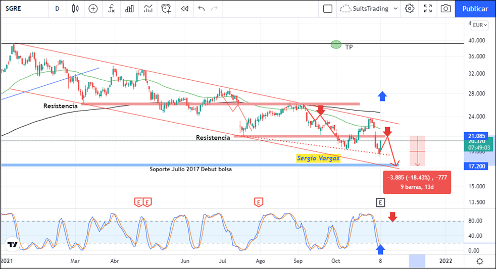 Evidentemente, el precio ha de generar un movimiento de retroceso a modo de pullback impulsado por el índice de fuerza relativa que está en niveles de sobreventa. Este movimiento llevará el precio nuevamente a los 21,02 euros del 19 de julio de 2021, que corresponde a la siguiente resistencia fuerte la cual es confirmada el 20 de septiembre. Si el precio respeta dicha resistencia, muy probablemente irá a buscar los objetivos en 17,20 euros lo cual equivale a un 18% de rentabilidad en el corto plazo.