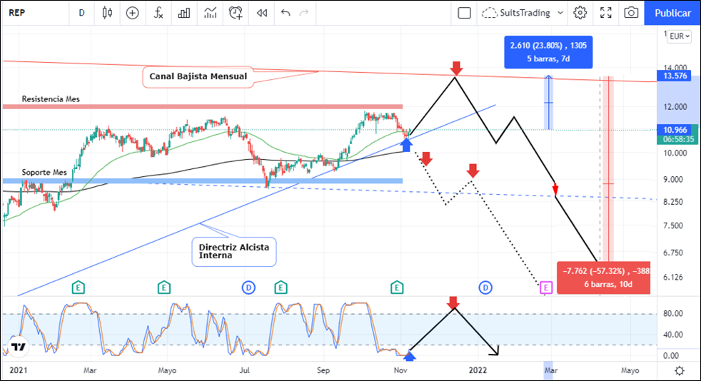 Por otro lado, si el precio visita los 12 euros y respeta el nivel superior del canal bajista, nos ubicaríamos nuevamente con la tendencia macro a la baja. Inclusive, si el precio decide realizar el quiebre de la tendencia alcista interna, así como de la media móvil exponencial de 250 periodos, nos indicaría muy probablemente, un movimiento más profundo a la baja en busca del nivel inferior del canal bajista en inmediaciones de los 5,3 euros por acción lo que representa más de un 50% de rentabilidad y/o desvalorización del precio de la acción de Repsol.