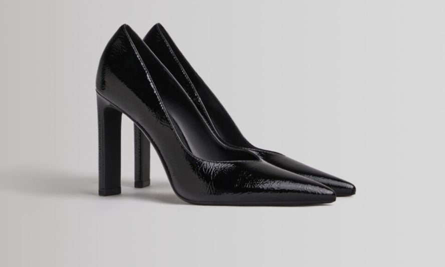 Toca un modelo igual de elegante y sofisticado, pero encima más barato en Bershka. Por 22,99 euros tienes este modelo con brillo de lo más clásico pero moderno. Está disponible de la talla 35 a la 41. Tiene un tacón de 10 cm., se vende en negro, con material efecto arrugado y escote en V. Está fabricado 100% en poliuretano.