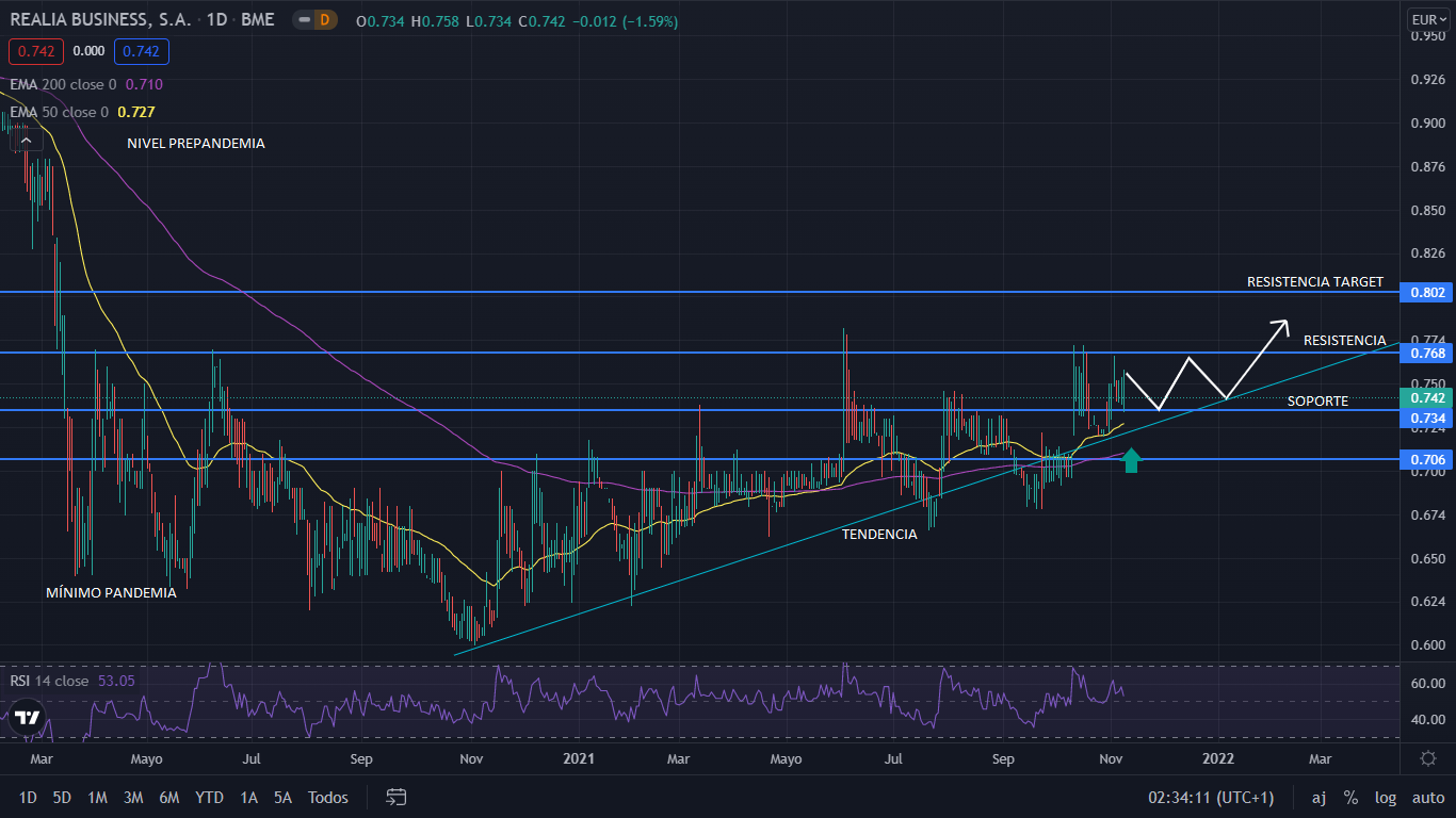 A nivel técnico, desde el mínimo marcado por la pandemia en los 0,63 euros, no fue hasta noviembre de 2020, que Realia paso a tendencia alcista, en la cual aún continua. Actualmente el precio se encuentra a superar los 0,76 euros, resistencia fuerte postpandemia. De tomar sus resultados positivos y su estructura técnica, para el medio plazo, Realia superaría dicha resistencia para el cierre del ejercicio de 2021, que de ser positivo, llevaría al precio a buscar sus siguiente resistencia en los 0,80 euros.