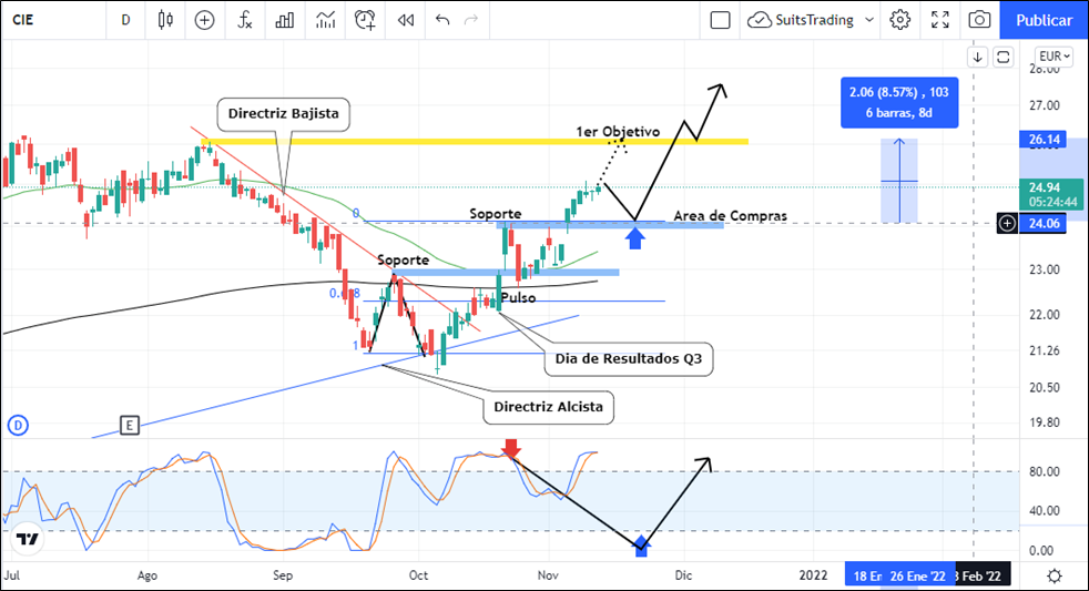 Actualmente, el precio de la acción podría presentar un nuevo movimiento de pullback hasta niveles entre los 23,5 euros y 24,12 euros los cuales corresponden el primero de ellos, al precio de cierre del 3 de noviembre y el gap de apertura del 4 de noviembre. El segundo de ellos confluye con el soporte que el precio deja a su paso posterior a la presentación de los resultados financieros en 24,10 euros. Este movimiento de retroceso estaría apoyado del índice de fuerza relativa que se encuentra en niveles extremos de sobrecompra lo cual presionaría el precio a la baja.
