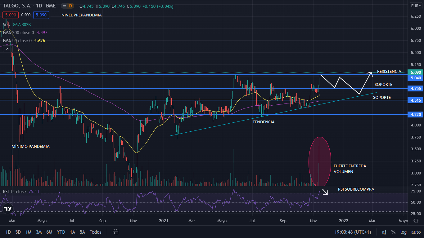 A nivel técnico, desde el mínimo marcado por la pandemia en los 3,66 euros por acción, Talgo ha crecido un 38%, y aún se sitúa a aun 23% de su nivel anterior a la pandemia. Actualmente el precio se sitúa sobre los 5 euros, tras haber subido un 8% con la publicación de resultados. Siendo este su máximo postpandemia. Para el corto plazo, su precio irá a buscar el soporte de los 4,75 euros, para después buscar la línea de tendencia. De no perder dicha tendencia, su precio volver a alcista, para cerrar el año sobre los 5,09 euros. El medio-largo plazo, Talgo apunta a alcista.