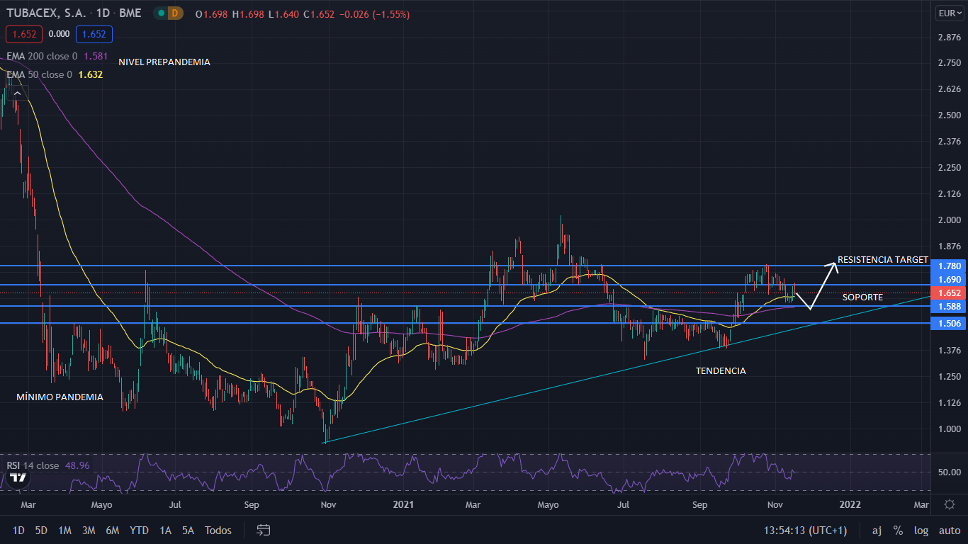 A nivel técnico, desde el mínimo marcado en marzo de 2020, Tubacex ha crecido un 48%, y aún se sitúa a un 58% de su nivel anterior a la pandemia. Actualmente su formación es de tendencia alcista, situando el precio en los 1,60 euros. Para el corto plazo, el precio retrocederá hasta el soporte de los 1,58 euros, donde rebrotará a alcista, para ir a buscar los 1,78 euros, donde cerrará el año. En el medio plazo, tomando la recuperación de su actividad, su proyección del precio apunta a continuar alcista, alcanzado los 2 euros, para el cierre del primer trimestre de 2022