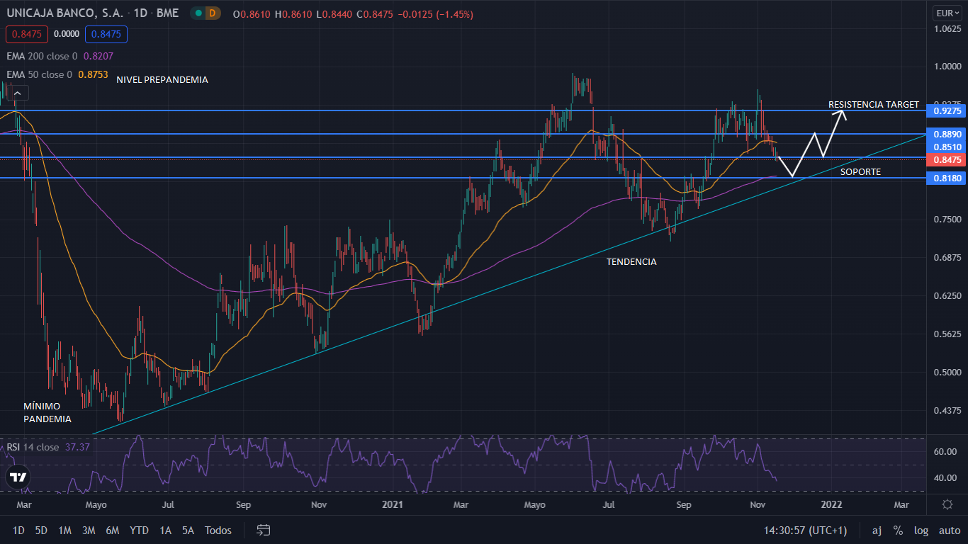 A nivel técnico, desde el mínimo marcado en marzo de 2020, Unicaja ha crecido hasta un 136% (104% actualmente) y situándose a un 14% de su nivel anterior a la pandemia. Actualmente el precio se muestra bajista, dentro de la formación de tendencia alcista, llevando el precio en el corto plazo hasta el soporte de los 0,81 euros, junto a la línea de tendencia. De no perder dicha tendencia el pecio iría a alcista, para cerrar el año en los 0,92 euros. Para el medio plazo, si Unicaja continúa alcista, su precio se situará sobre el 1 euro, de cara al inicio de 2022, si sus resultados a cierre del ejercicio 2021 concluye positivo.
