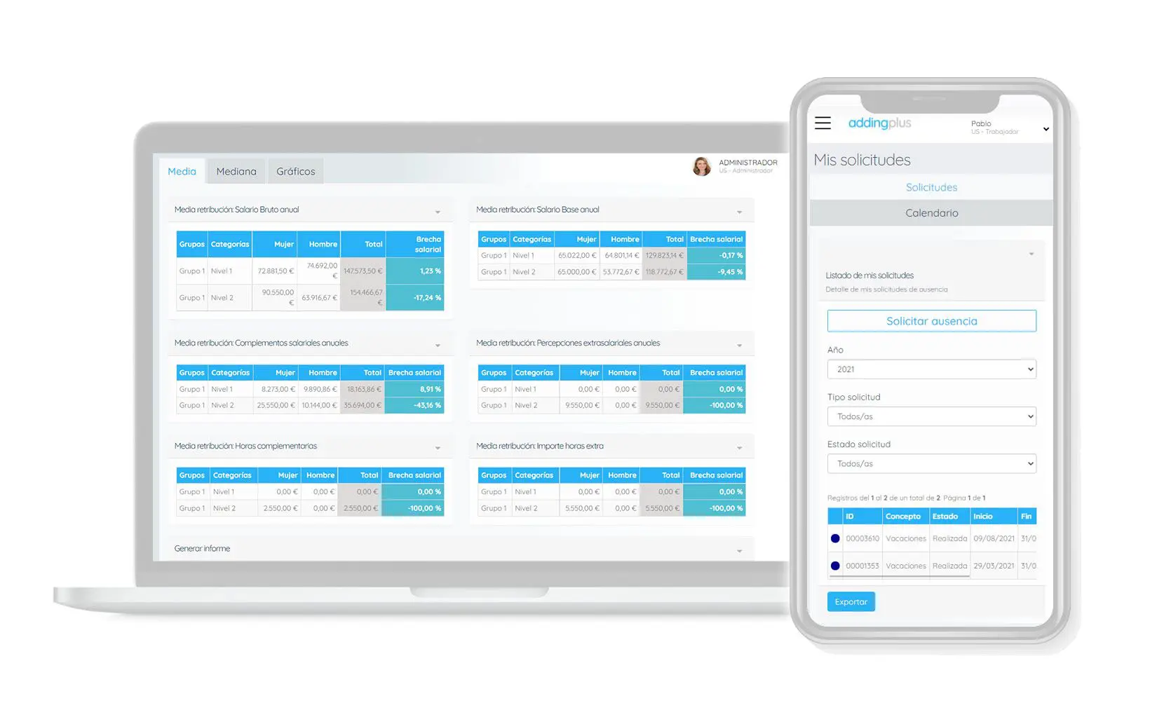 La realización del registro salarial obligatorio y el cálculo de la brecha salarial puede resultar un proceso largo y costoso. Contar con herramientas como Checkplus Presence, la solución para la gestión centralizada de empleados y para el control horario de Addingplus, facilitan enormemente este trabajo a los responsables de Recursos Humanos. Gracias a las nuevas funcionalidades incorporadas, el responsable de Recursos Humanos no solo puede tener el control de las horas trabajadas, gestionar ausencias, vacaciones y nóminas, sino que ahora puede generar el informe del registro salarial obligatorio, con el cálculo de la brecha salarial incluido.