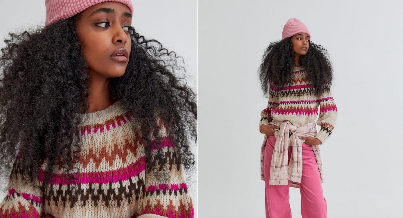 Si estás buscando algo genuino, con un toque retro, este jersey de punto jacquard de Pull&Bear te encantará. Está disponible en varias tallas, y también lo puedes comprar con fondo en crudo como el de la imagen o con fondo marrón. El precio es 29,99€ en los dos casos.