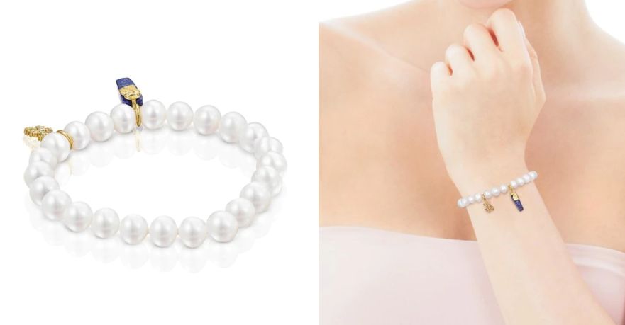 Volvemos con las pulseras, y con una opción más cara que la primera que vimos de Tous. Se trata de un impresionante modelo de perlas cultivadas de agua dulce de forma barroca de 8mm con oso coral de 10mm y anemona con lapislázuli de 16mm de plata vermeil. La longitud de la pulsera es de 16,5cm, con la plata de primera ley recubierta de oro de 18kt con un espesor de 3 a 5 micras y sin ningún otro metal entre ambos. Su precio en El Corte Inglés es de 135 euros.