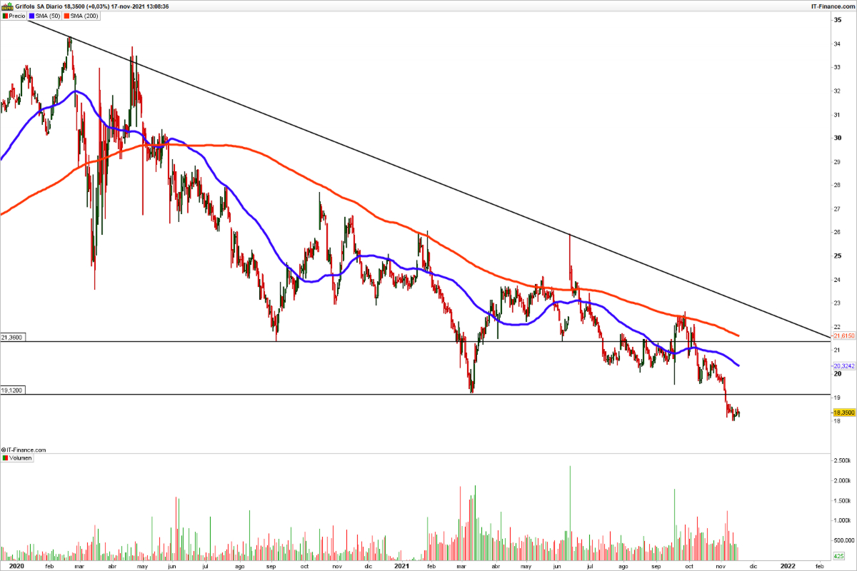Los tres valores están muy próximos a los mínimos del año y tratan de consolidar la posición para tratar de volver a iniciar las subidas. En caso contrario, los siguientes soportes se encuentran lejos de las cotizaciones actuales. En el caso de Grifols, habría que remontarse a niveles de 2016 para ver precios similares a los actuales tras romper a la baja la zona de los 19 euros, que eran los mínimos anuales hasta ahora. Las acciones del holding controlado por la familia catalana Grifols están a un 10% de caída del soporte marcado hace cinco años, y a un 73% de sus máximos históricos.