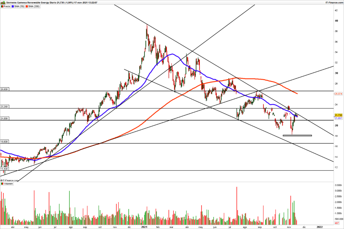 Siemens Gamesa, por otro lado, ocupa la última posición por rentabilidad anual dentro del Ibex 35. La compañía presidida por Andreas Nauen dibuja un perfecto canal bajista, aunque se sostiene en la medida móvil de medio plazo, entre los 21 y 21,9 euros.