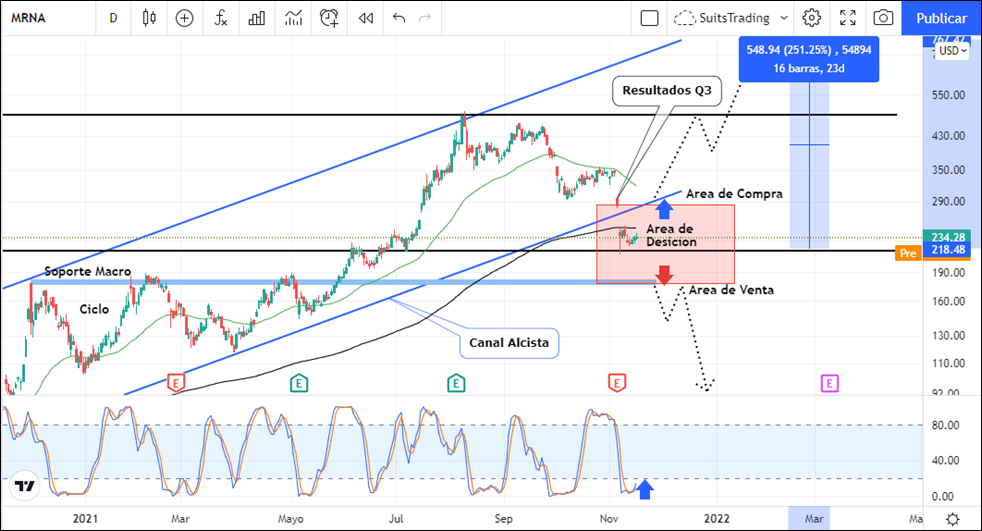 Si detallamos el gráfico de marco diario de Moderna, técnicamente la acción ha quebrado el nivel inferior de un canal alcista que venía desarrollando desde mayo de 2020. Adicional a ello ha realizado la ruptura de la media móvil exponencial de 250 periodos de largo plazo la cual puede ejercer presión bajista para que el precio visite el área de soporte más importante en inmediaciones de los 180 dólares por acción. Este nivel de soporte lo ubicamos a finales de 2020 e inicios de 2021 los cuales crearon un cierre de ciclo. Por lo tanto, si el precio visita dicho soporte y realiza su ruptura, podríamos ver las acciones de Moderna en cercanías de los 50 dólares por acción.