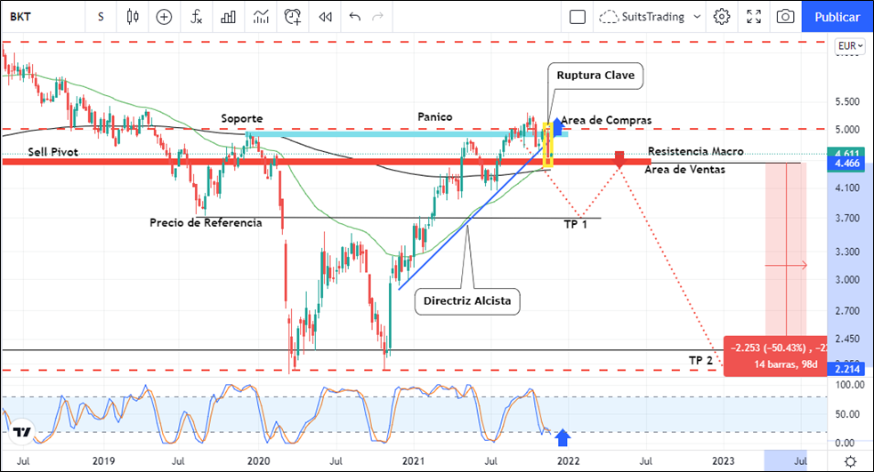 Aunque los resultados financieros presentados del tercer trimestre consolidan a Bankinter como uno de los mejores bancos no solo en España sino en Europa, no fueron suficientes para posicionar el precio de la acción arriba de los niveles psicológicos de 5 euros. Por el contrario, con el cierre de vela semanal la acción de Bankinter realizó una sólida ruptura de la última directriz alcista que se funda desde diciembre de 2020 la cual hace prever un posible movimiento de punto de giro a la baja.