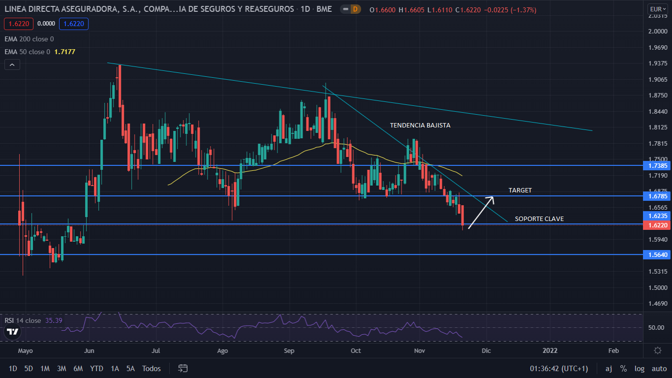 A nivel técnico, el grafico de Línea Directa apenas con un histórico de más de 6 meses, nos deja unos soportes claros. Actualmente su formación es tendencia bajista, siendo el soporte de los 1,62 euros clave para que su precio no continúe bajista. Para el corto plazo, el precio irá alcista, perforando la línea y dejando el precio fuera de la tendencia, lo que para el cierre del año, lo haría sobre los 1,67 euros. Aun saliendo de esta línea de tendencia, su formación en temporalidad superior es bajista, por lo que en el medio plazo, el precio iría a buscar los 1,80 euros, nivel donde se sitúa dicha tendencia.