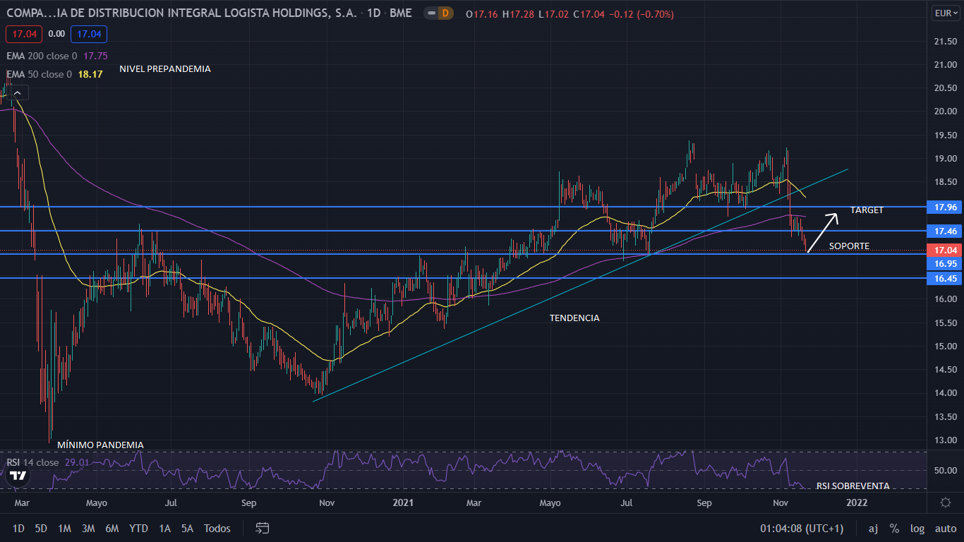 A nivel técnico, desde el mínimo de marzo de 2020, Logista había alcanzado un crecimiento del 49% justo antes de la caída del 11% de este mes, y situándose a día de hoy a un 22% de si nivel anterior a la pandemia. Actualmente el precio se sitúa fuera de la tendencia alcista, sobre el soporte de los 17 euros. Siendo este nivel clave para que la caída sea una corrección. Para el corto plazo, con el indicador RSI en sobre venta, el precio irá a alcista hasta cerca del nivel de los 18 euros, donde cerraría el año. De continuar con la recuperación tras la pandemia, y el aumento en la demanda del uso de los servicios de paquetería, Logista para el largo plazo, apunta a alcista.