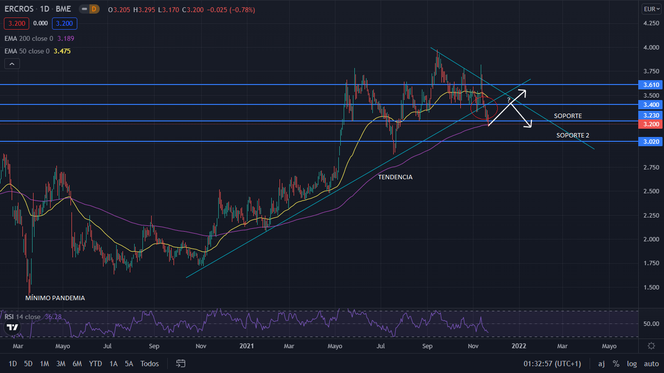 A nivel técnico, desde el mínimo de marzo de 2020, Ercros ha crecido hasta un 180% (un 127% actualmente) y situándose a un 73% de su máximo histórico. Actualmente el precio ha perdió la tendencia alcista, y se sitúa sobre el soporte de los 3,23 euros. Para el corto plazo, dicha caída en primera instancia la tomaríamos como una corrección en el precio, por lo que Ercros rebotaría en el soporte actual, e iría a buscar los 3,40 euros. Añadir que el precio podría caer hasta el soporte de los 3,02 euros, antes de volver a alcista. Para medio plazo, si sus resultados al cierre del ejercicio de 2021, cumple con sus estimaciones, el precio volvería a alcista de cara al inicio del año 2022.