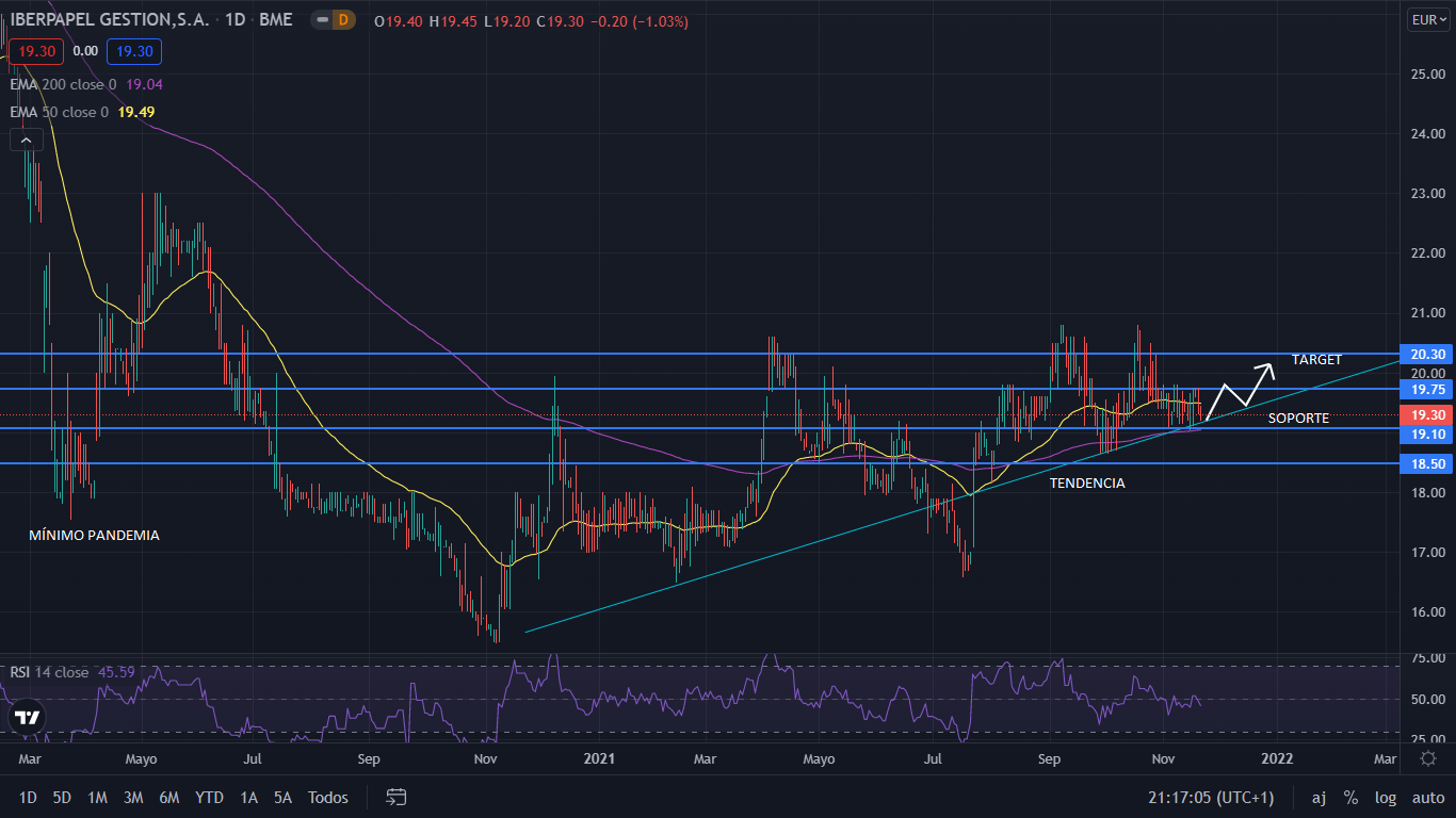 A nivel técnico, desde el inicio de la tendencia alcista en noviembre de 2020, un año después Iberpapel se ha apreciado un 24%. Situándose a un 20% de su nivel prepandemia, y un 35% de su nivel al cierre de 2020. Actualmente el precio se encuentra sobre los 19 euros, junto a la línea de tendencia alcista. Para el corto plazo, el precio ir a buscar los 20 euros, para el cierre del 2021. Para el medio plazo, de continuar con sus resultados positivos, y su crecimiento homogéneo, la proyección del precio para Iberpapel es alcista.